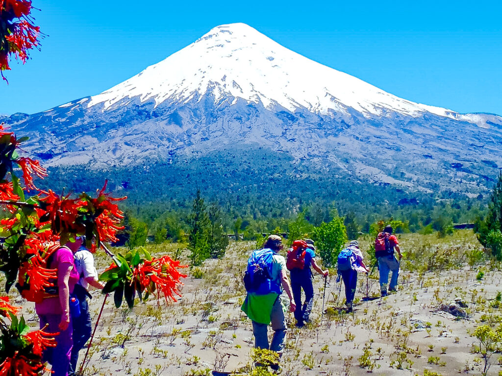 Dieser Trekking-Tag hat seinen Reiz durch seine Kontraste. Direkt von der Lodge weg geht es über Lavafelder und durch Coigue-Wälder bis zum Fuss eines ausgewaschenen Bachbettes. Entlang dieser kleinen Schlucht steigen wir dem Vulkan Osorno entgegen und schwenken dann kurz vor dem Pass Desolación ab Richtung Norden. Von hier oben haben wir eine wunderschöne Aussicht über den Todos-los-Santos-See und die verschiedenen Berge der Cordillera de los Andes del Sur. Wir erkennen deutlich, wie der letzte Ausbruch des Vulkans diese Landschaft prägt und wie viel pyroklastisches Material vom Nachbarvulkan Calbuco deponiert wurde. Am Nachmittag geht es durch einen dichten Mischwald hinunter an den Strand zur idyllischen Bucht El Rincón, wo ein Motorboot auf uns wartet und uns zurück zur Petrohué-Lodge bringt.