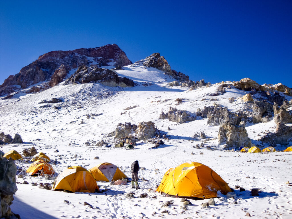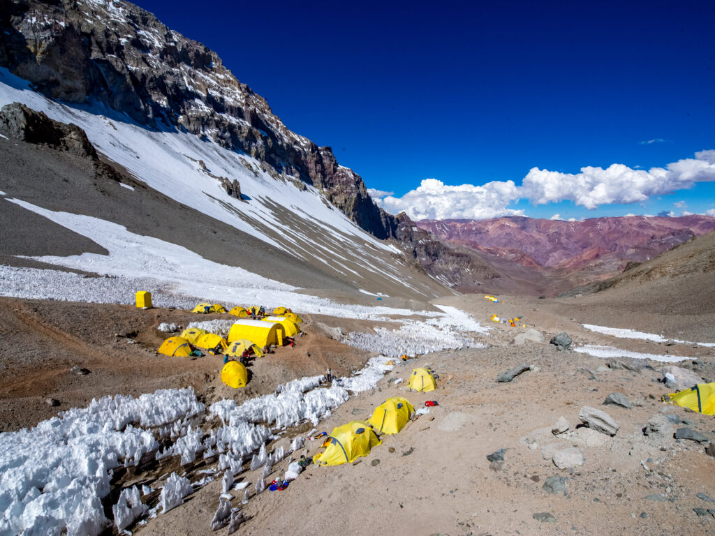 Nach drei Trekkingtagen erreichen Sie das Basislager Plaza Argentina auf 4’300 Metern. Eine Zeltstadt mit internationalem Flair, medizinischer Betreuung und idealer Infrastruktur für die Akklimatisation.