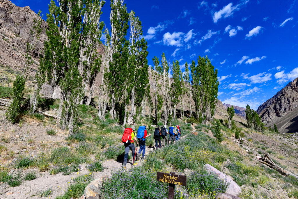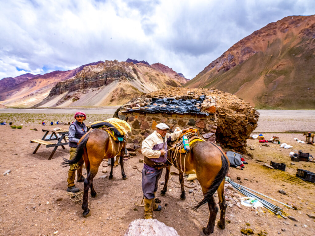 Unsere Route folgt dem Río de las Vacas entlang. Der eher trübe Fluss wird von verschiedenen Seitenflüssen gespeist. In gemächlichem Tempo unterwegs, ist diese Strecke ideal, um sich gut an die Höhe zu gewöhnen. Nach ca. 5 – 6 Stunden erreichen wir den nächsten Lagerplatz, Casa de Piedra. Kurz vor der Ankunft wird erstmals der Blick frei auf den riesigen Aconcagua und die mächtige Südwand.