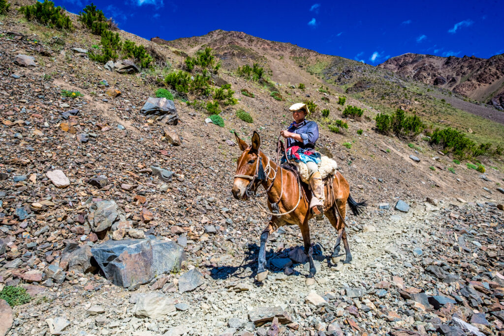 Gegen Mittag erreichen wir den Parkeingang. Hier wird unser Essen und Hauptgepäck auf die Maultiere aufgeladen. Mit einem kleinen Tagesrucksack beginnt nun das Trekking am Punta de Vacas. Die Route ist abwechslungsreich und wir tasten uns langsam in die Höhe vor. Die erste halbe Stunde sind wir noch von einzelnen Bäumen umgeben, danach wird es karg. Einzelne stachlige Sträucher begrünen die Gegend. In gemächlichem Tempo unterwegs, haben wir genügend Zeit, Eidechsen in ihren schillernden Farben zu beobachten. Nach ca.5 Stunden erreichen wir das erste Lager in Pampa de Leñas auf 2864 m.