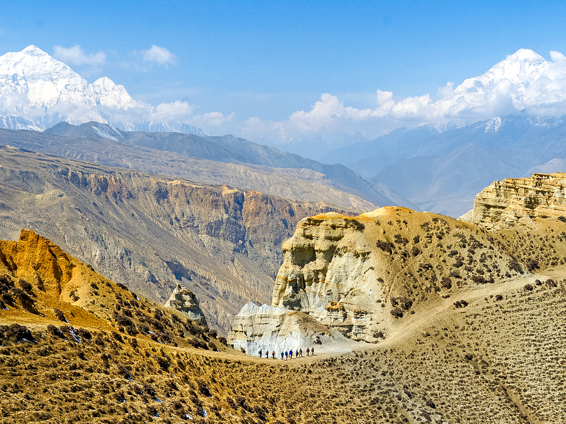 Eine landschaftlich fantastische und lange Etappe steht uns bevor. Zuerst überqueren wir den Tange-Khola-Fluss und steigen dann über mehrere Plateaus, hoch über dem Kali-Gandaki-Tal gelegen. Wir kommen bei Paha (4060 m) vorbei. Von hier aus haben wir einen fantastischen Blick auf Nilgri, Annapurna und Dhaulagiri. Wir folgen dem Höhenweg bis nach Chhusang, immer wieder mit atemberaubender Aussicht auf die Schneeberge. Wanderzeit ca. 9 – 10 Stunden.