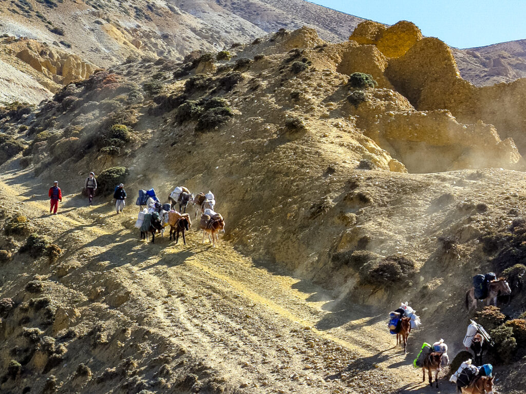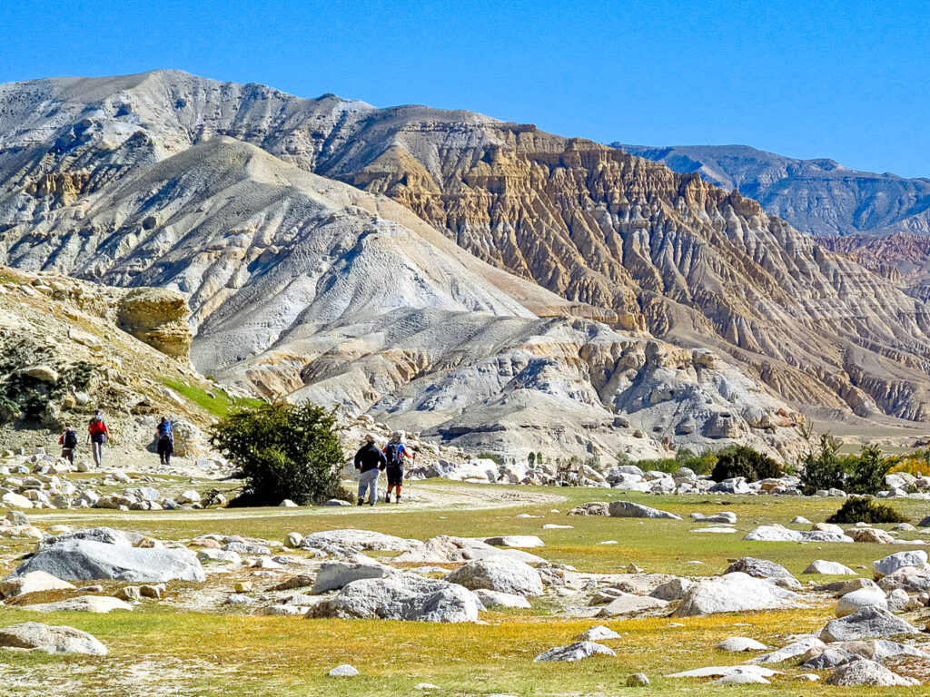 Der Trekking-Alltag beginnt um ca. 7 Uhr mit dem Frühstück. Unsere Begleitmannschaft verteilt unser Gepäck auf die Maultiere und Träger. Von nun an sind wir zu Fuss unterwegs. Dem Kali-Gandaki-Fluss folgend, führt uns der Weg nach Chele (3050 m) und weiter hinauf nach Samar (3660 m). Obwohl dieses obere Mustang-Gebiet eigentlich durch eine karge, baumlose Landschaft dominiert wird, überrascht Samar mit grünen Bäumen und einem sehr schönen Blick auf die Eisriesen Nilgiri und Annapurna. Wanderzeit ca. 4 – 5 Stunden.